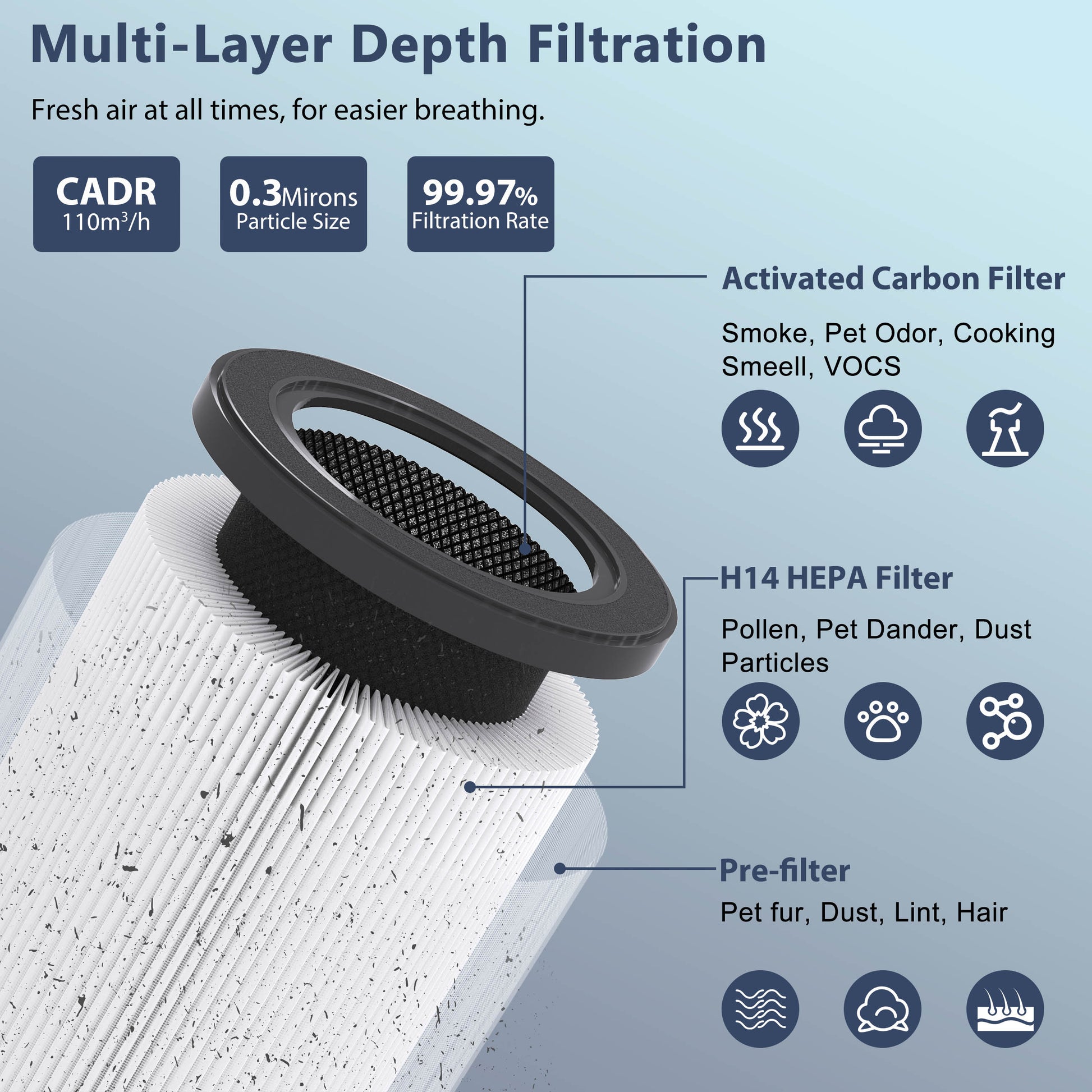 3-stage H14 True HEPA Filtration System -- Pre-Filter: Captures large particles such as dust, lint, fibers, hair and pet fur. H14 True HEPA Filter: Traps at least 99.99% airborne particles 0.1 microns in size, such as fine dust, smoke particles, and allergens such as pollen and pet dander. Activated Carbon Filter: Physically absorbs smoke, odors and fumes.